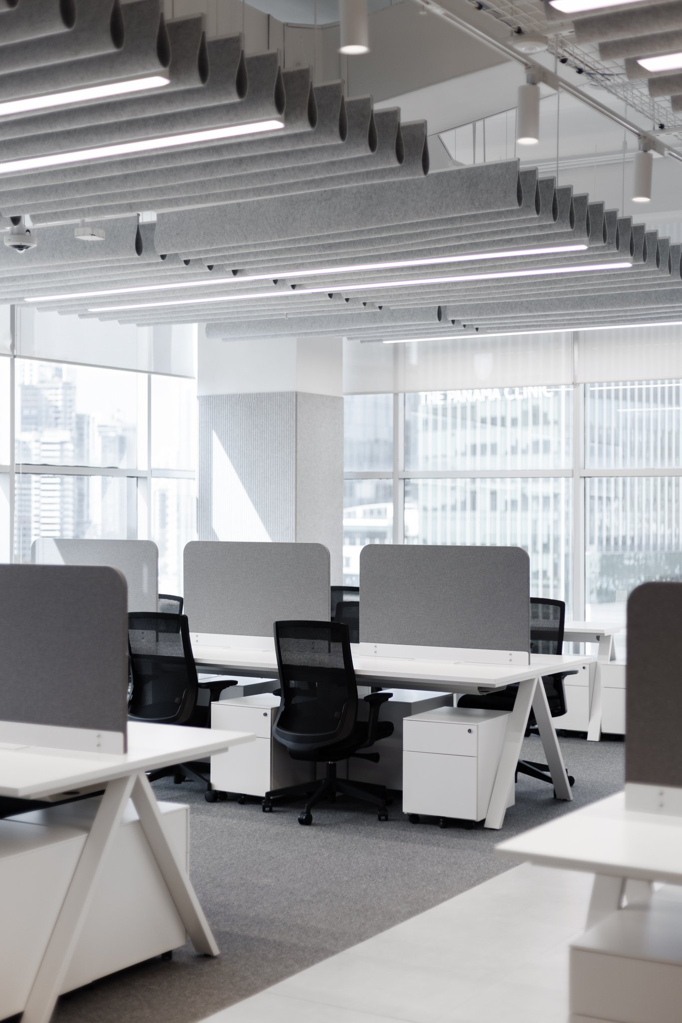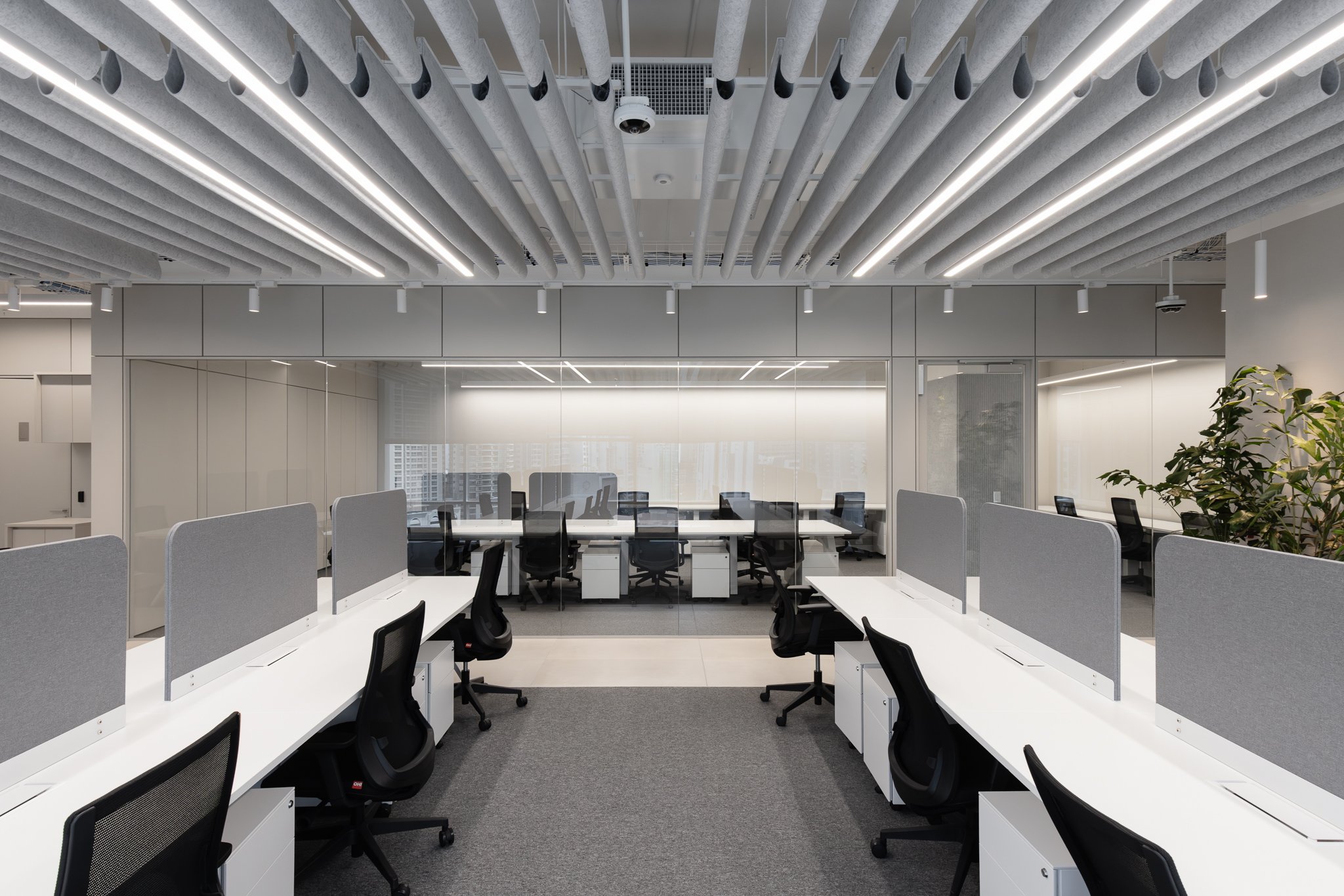 Se instalaron baffles acústicos suspendidos tipo Gota, dispuestos de forma lineal y continua, generando ritmo visual y mejorando el confort sonoro sin interferir con la iluminación ni la altura libre. La solución combina desempeño acústico y claridad formal, aportando identidad y funcionalidad al ambiente corporativo.